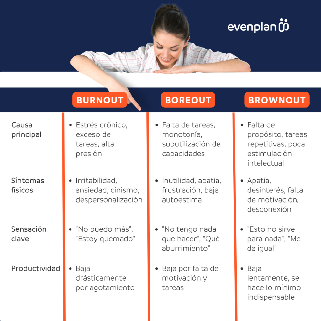 Por su parte, el brownout es el más silencioso de los tres. Se trata de la pérdida de sentido en el trabajo. El colaborador cumple con sus funciones, pero sin compromiso ni entusiasmo. Este fenómeno suele estar ligado a culturas organizacionales donde el propósito no es claro o no se comunica de manera efectiva.